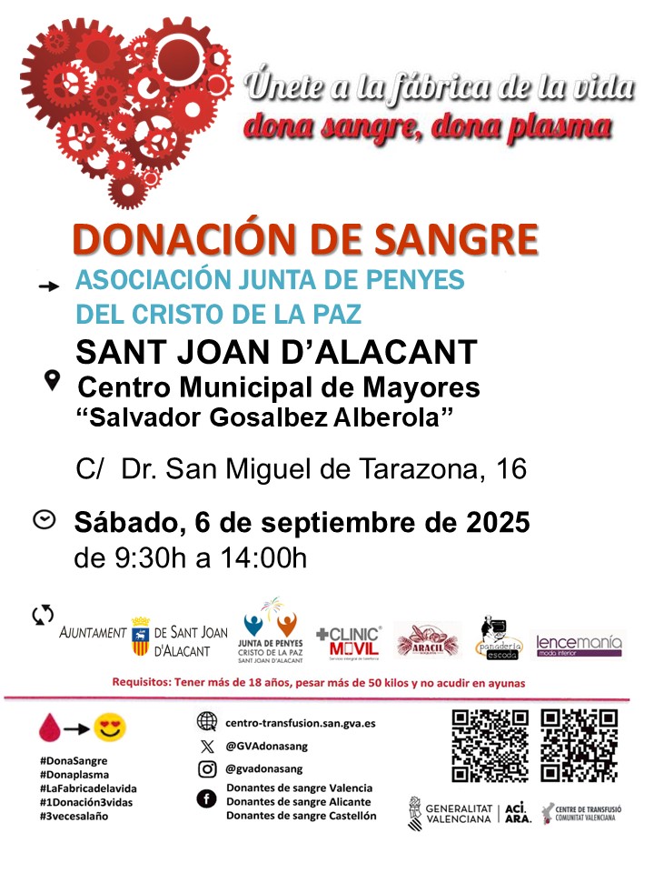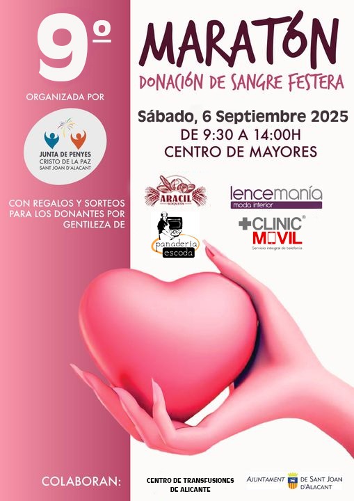 Organizado por la Junta de Peñas Sant Joan d’Alacant y Centro de Transfusió Comunitat Valenciana con la colaboración del Ayuntamiento de Sant Joan d’Alacant.