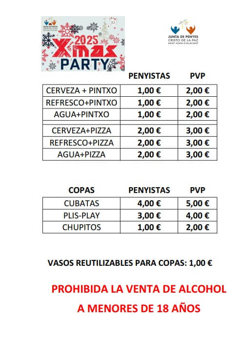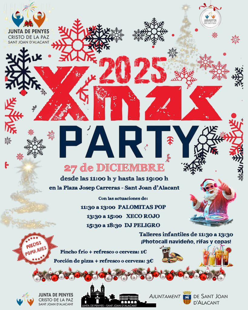 La Junta de Penyes us convida amb gran il·lusió a celebrar estes festes amb nosaltres el pròxim 27 de desembre, en una jornada plena d’alegria on no faltarà la bona música i fantàstiques actuacions en directe per a animar l’ambient; us esperem per a brindar i compartir una bona estona amb copes i deliciós *tapeo a preus populars, veniu a gaudir i a fer poble amb nosaltres en esta cita tan especial!